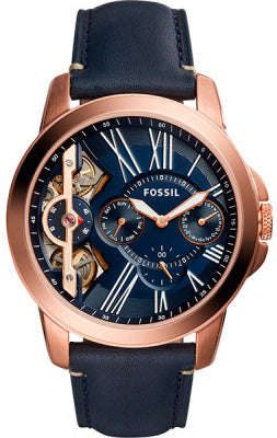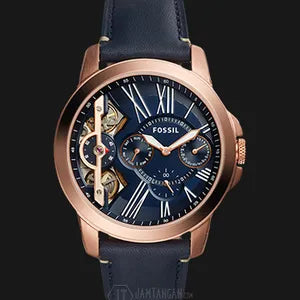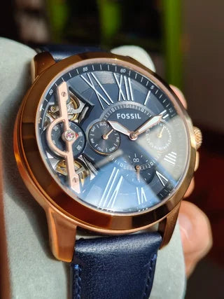 Com sua caixa em aço inoxidável na cor ouro rosé, o Fossil exala luxo e personalidade. O mostrador azul profundo, enriquecido com detalhes em engrenagem aparente, revela o mecanismo interno em movimento — um charme irresistível para quem aprecia a arte da relojoaria.