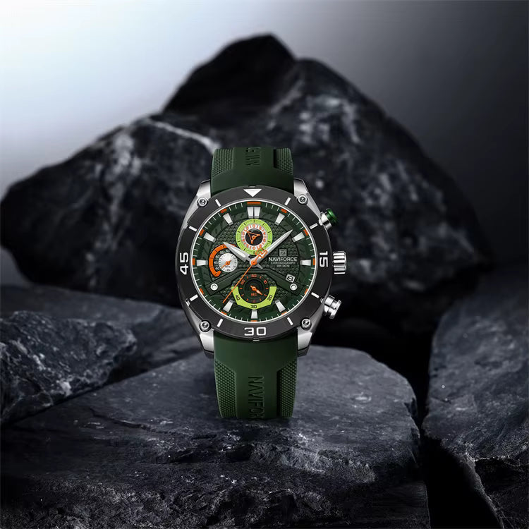 O Naviforce 8038 não é apenas um acessório — é uma declaração. Seu mostrador robusto com detalhes metálicos e pulseira silicone premium transmite confiança e sofisticação. Ideal para quem quer se destacar no escritório, em eventos ou até mesmo em aventuras ao ar livre.